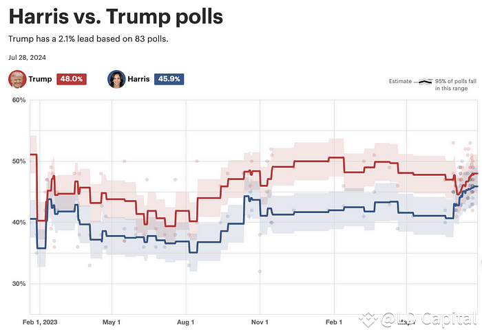 如我们在周一发布的视频所料,民主党换了更年轻的候选人后,支持率大幅上升超过了拜登,综合民调显示哈里斯目前仅落后特朗普1~2个百分点,这令大选结果变得不可预测,并给经济政策前景带来不确定性: