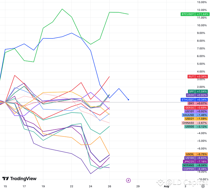 越来越多观点认为日美货币政策的转折点即将到来,日元的套利交易似乎有解除的迹象,USDJPY从接近162跌到最低152附近。变盘时点是711的弱于预期的CPI,加密货币也是从那个时刻开始反弹(BTC5w7–6w8),科技股也是从那时开始走弱,可以看出机构选择在利润已经非常丰厚的大科技上开始“卖事实”。