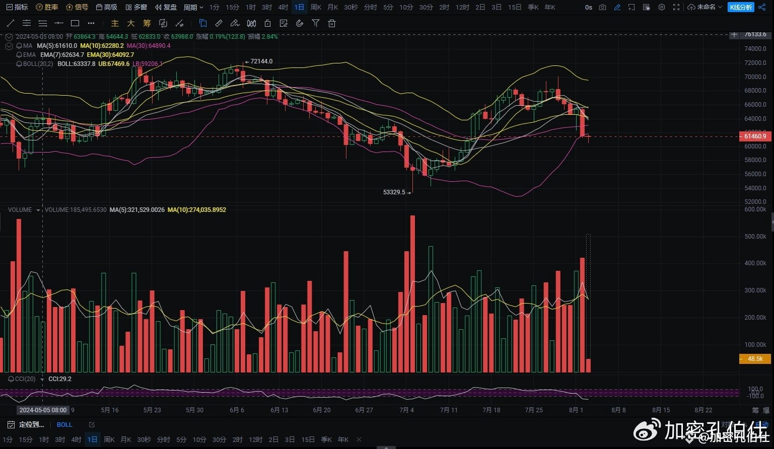 预计今日市场将会在60,000-64,000 美元区间震荡,反弹的可能性较大,但反弹幅度有限。