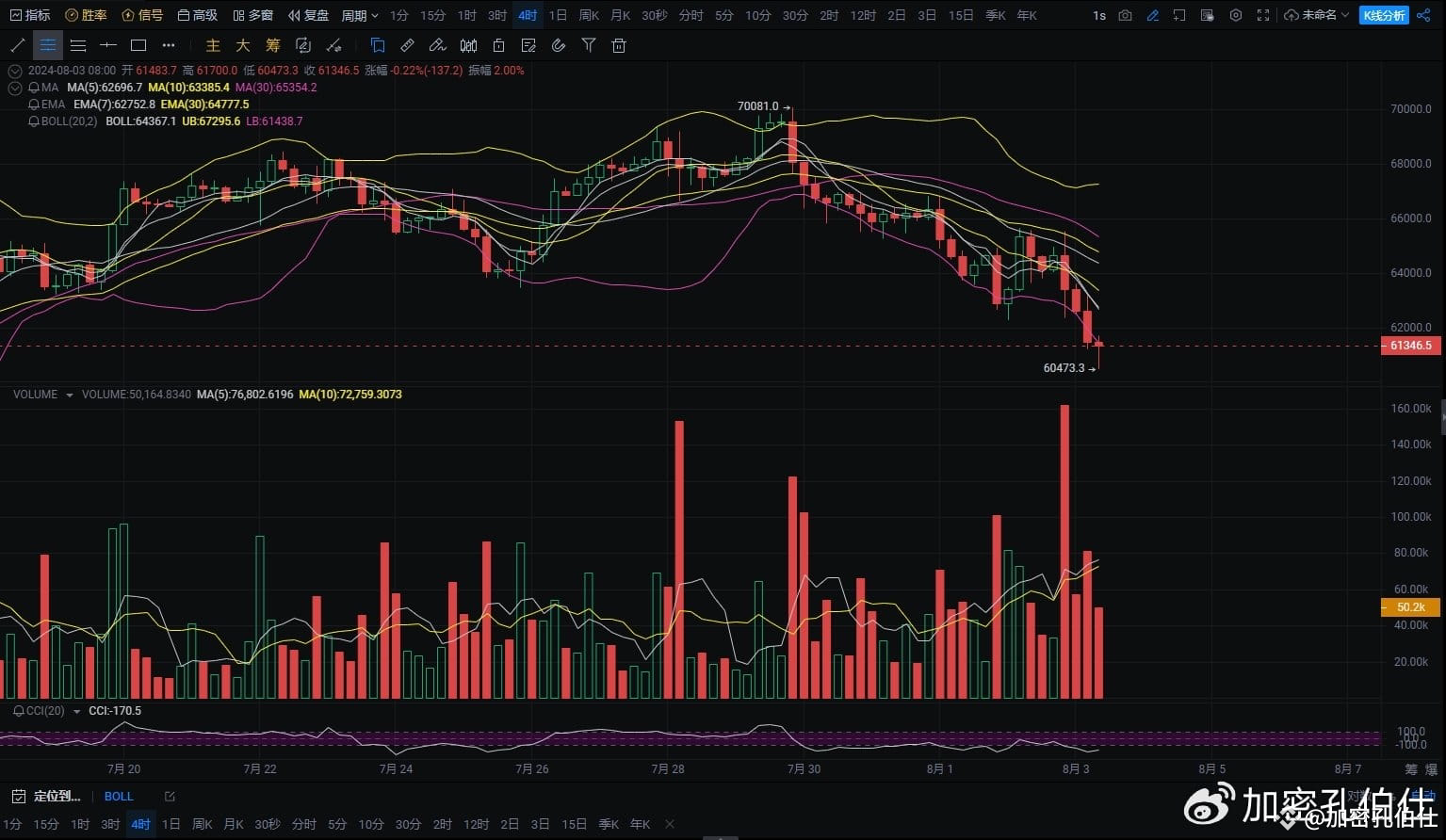 压力位:64,000 美元(布林带中轨及短期均线压制区域)