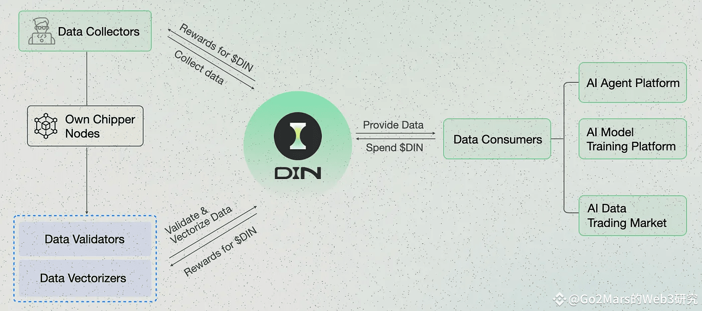 在这样的背景下,DIN(原名Web3Go)作为首个模块化AI原生数据预处理层,应运而生。DIN旨在通过去中心化的数据验证和矢量化处理,让每个人都能为AI提供数据并获得报酬,引领一个人人都能通过个人数据变现,企业能够更高效经济地获取数据的数据经济潮流。目前,DIN已经从Binance Labs获得了400万美元种子轮融资,并后续从其他机构、社区和KOL网络中获得额外400万美元pre-listing融资,当前估值8000万美元,显示出市场对其巨大潜力和未来发展的高度认可。其合作伙伴包括Polkadot、BNB Chain、Moonbeam Network和Manta Network等。