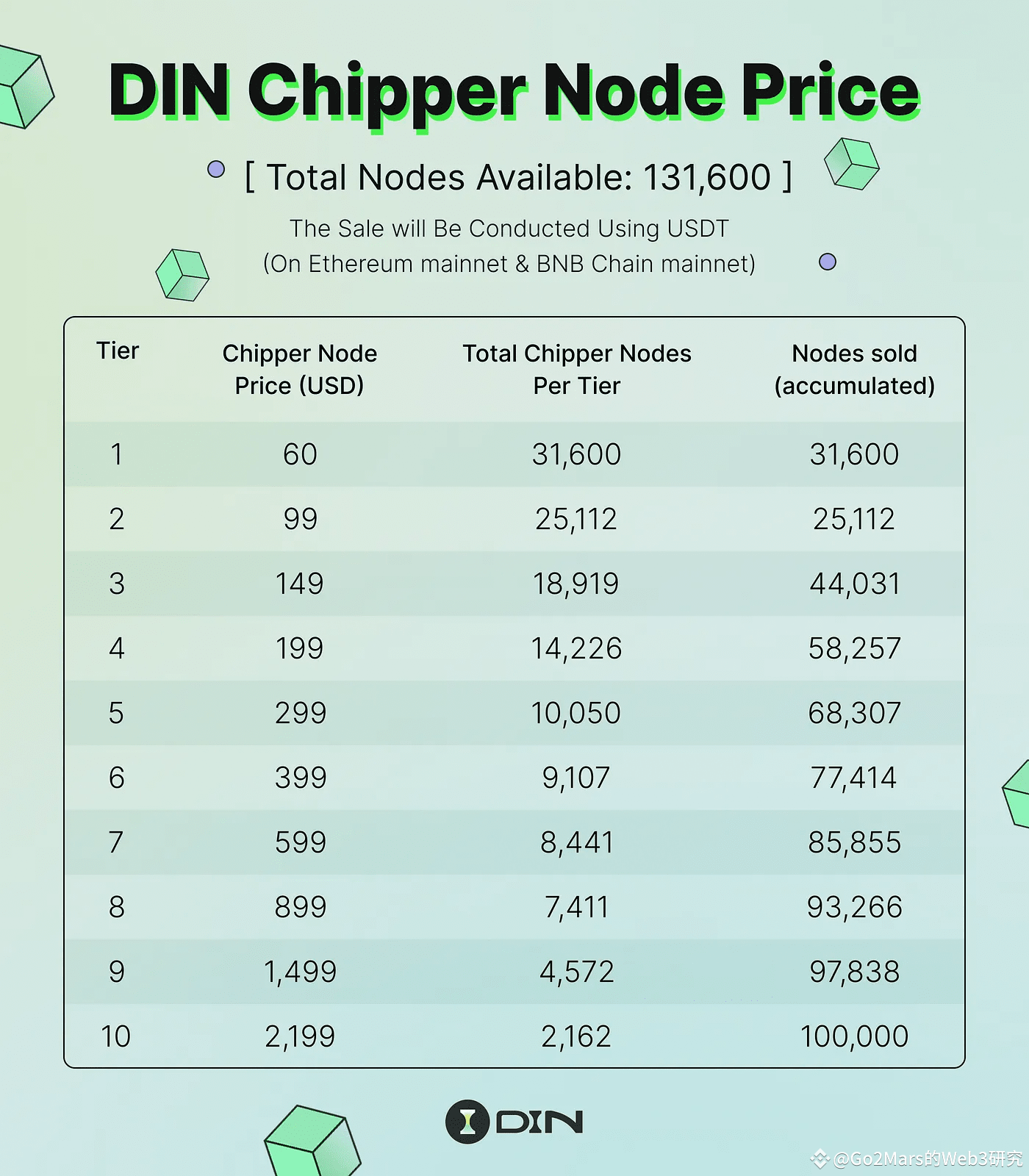 2. DIN的节点销售分为三个阶段:预售轮、白名单销售轮和公开销售轮。每个阶段的销售价格和条件有所不同,以吸引不同类型的投资者。预售轮主要面向早期产品用户和社区核心贡献者;白名单销售轮面向特定机构、社区和KOL合作伙伴;公开销售轮则面向广大公众投资者开放。