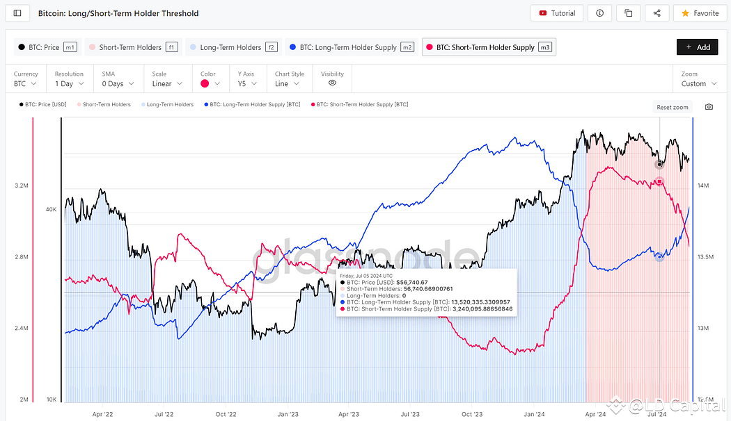 BTC长期持有者在2024年4月下跌之后停止了抛售,5–6月缓慢积累,7月之后,积累的速度加快。长期持有者在该震荡区域内仍然在积累筹码。