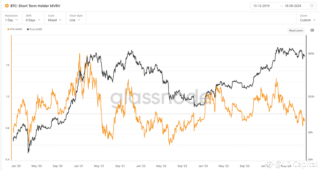 短期持有者MVRV在8月5日的下跌中达到0.84,属于2023年初以来最低水平。从中长期来看,这里属于低吸建仓的位置。