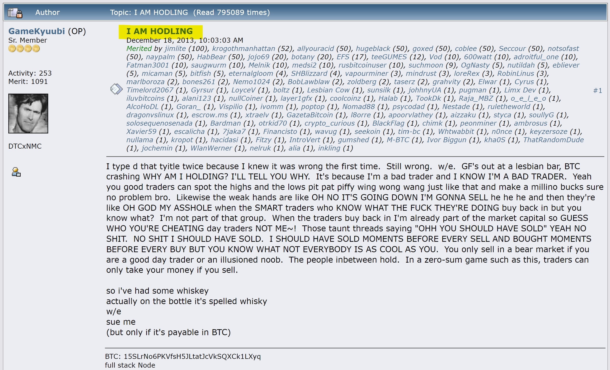 The post came at a time of a very bad Bitcoin crash from the then ATH of nearly $1200 all the way down to below $400 levels, a drop of more than 67% and it was the only post that brought a bit of fun to the community during those dark days, so it comes as no surprise that it made an impact and thus, a new slang was born. Today we see it used pretty much everywhere, even making its way into the US congress a few years back.