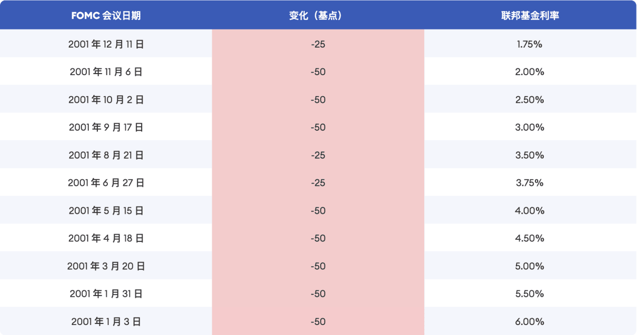 1990年代末,互联网技术快速发展与普及引发过度投机,非理性繁荣的狂热导致大量资金流入互联网投。1999年10月至2000年3月,纳斯达克指数在五个月时间里最高上涨88%。1999年6月至2000年5月,美联储累计加息6次、共275BP,以应对经济过热。2000年3月,纳斯达克指数触顶后快速下跌,互联网泡沫逐渐破裂,大批互联网企业破产倒闭,经济随之陷入衰退。2001年1月3日,美联储宣布降息50BP,后累计降息13次、共550BP,政策利率上限由6.5%下降至1.0%。