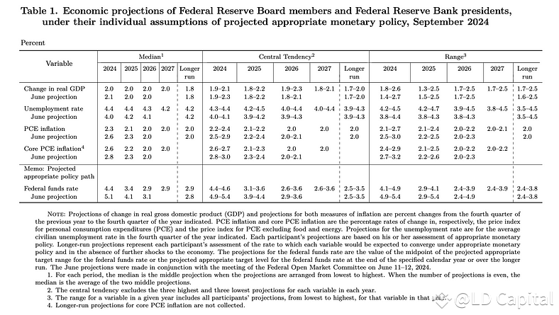 经济预测方面,美联储将今年的GDP增速预期从2.1%下调至2.0%,将失业率预期从4.0%大幅上调了至4.4%。并将PCE通胀预期从2.6下调至2.3%。美联储的数据和表述上都显示出对遏制通胀的信心增强,同时更加关注就业。整体上较大幅度的首次降息和较为鹰派的降息节奏,美联储又大玩了一把预期管理。