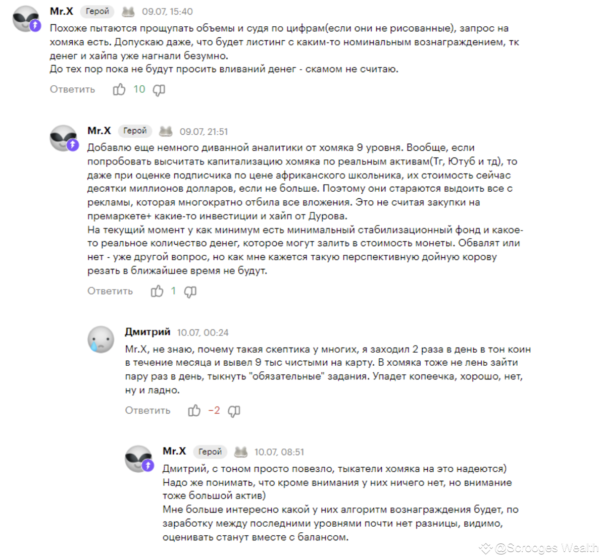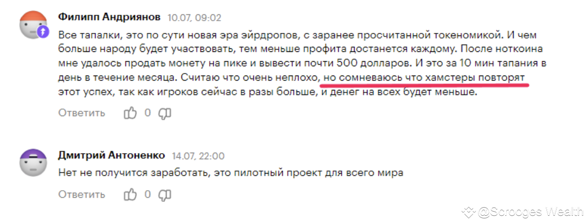 Посчитаем окупаемость своего времени относительно всего процента монет, которые в несколько этапов раздадут комьюнити. Это около 85%, то есть 85 млрд / 83 млн пользователей и получим около 1000 монет в руки, это уже приятнее, но все равно составляет всего 50 баксов. А если учесть, что распределение будет неравномерным из-за разницы в прокачке аккаунтов, то можно предположить негатив в отношении игры со стороны такой большой аудитории. При высокой волатильности цифровых активов, скорость слива цены Хомяка может быть ошеломительной. По этой причине команда приняла решение замораживать монеты. Вестинг предусмотрен в районе 4 месяцев. Это значит, что в этот период пользователь ничего не сможет сделать с активом, только наблюдать, как меняется цена токена Hamster Kombat. Старт торговли криптовалюты на Binance считается хорошим знаком - данная биржа для торговли криптовалютами старается размещать на платформе только перспективные проекты. Но в эпоху огромного количества мемкоинов принципы площадки могли измениться, каждой компании хочется заработать на хайпе. В отзывах об игре бытуют разные мнения.