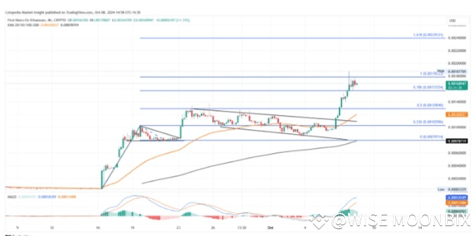 In the 4-hour chart, the first Neiro on Ethereum reveals a bullish trend continuation with a bullish pennant and a falling channel breakout. Currently, the falling channel breakout rally tests the 0.0018% resistance level, teasing a potential sideways shift.Â
