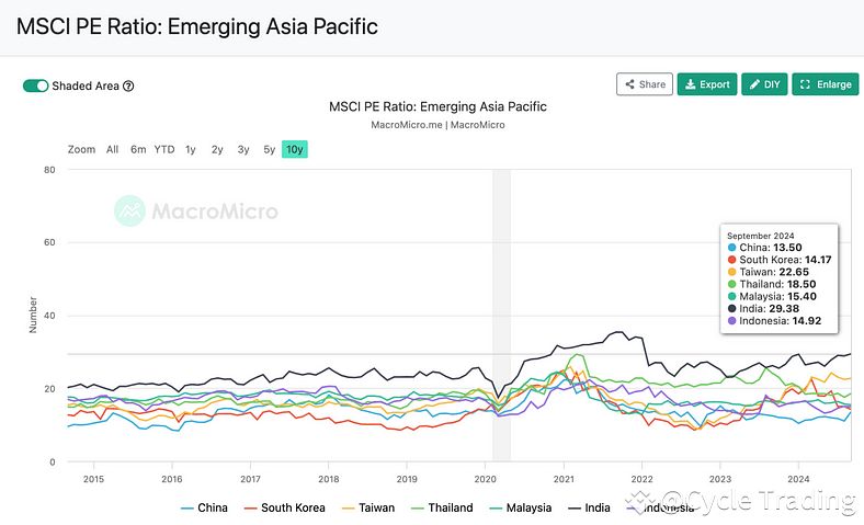 历史纵向对比,9月底反弹程度较高,已经到达了23年初对疫情重启的经济加速预期的PE倍数。全球主要市场的横向对比,中国市场相对新兴市场的估值目前依然是亚太地区最低,接近韩国的水平。