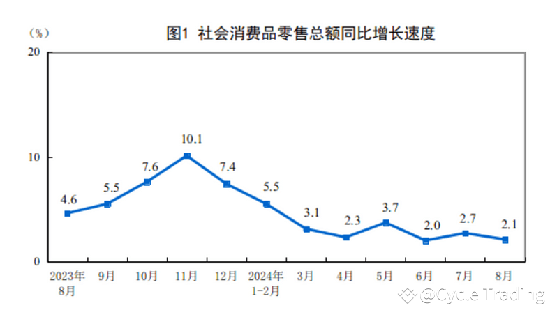 8月份,社会消费品零售总额38726亿元,同比增长2.1%。