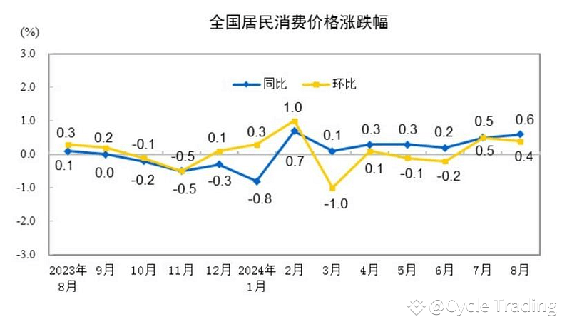 2024年8月份,全国居民消费价格同比上涨0.6%。其中食品价格上涨2.8%,非食品价格上涨0.2%;消费品价格上涨0.7%,服务价格上涨0.5%。1 — 8月平均,全国居民消费价格比上年同期上涨0.2%。
