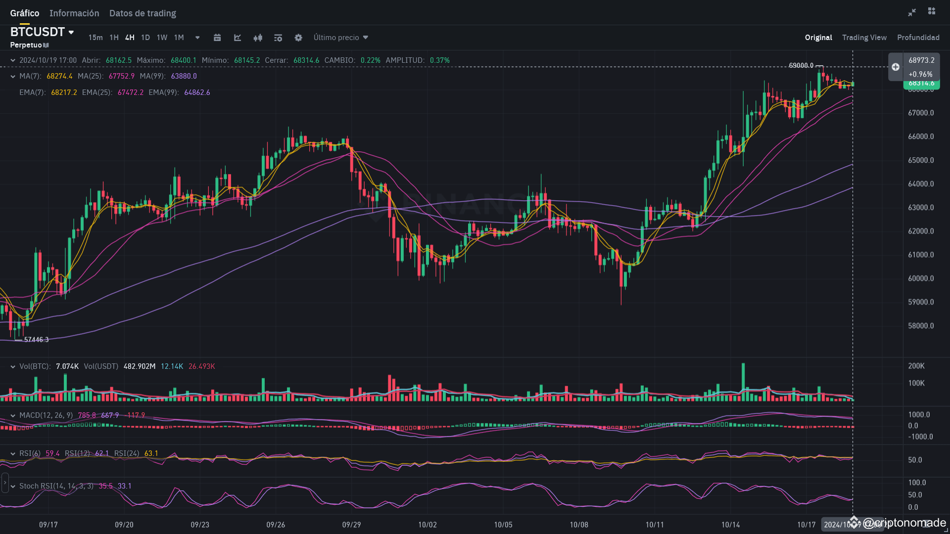 El gráfico de 4 horas de BTC/USDT muestra una tendencia alcista en las últimas 24 horas, con un cierre actual en 68314 Sin embargo, el panorama técnico sugiere que una corrección podría estar en camino.