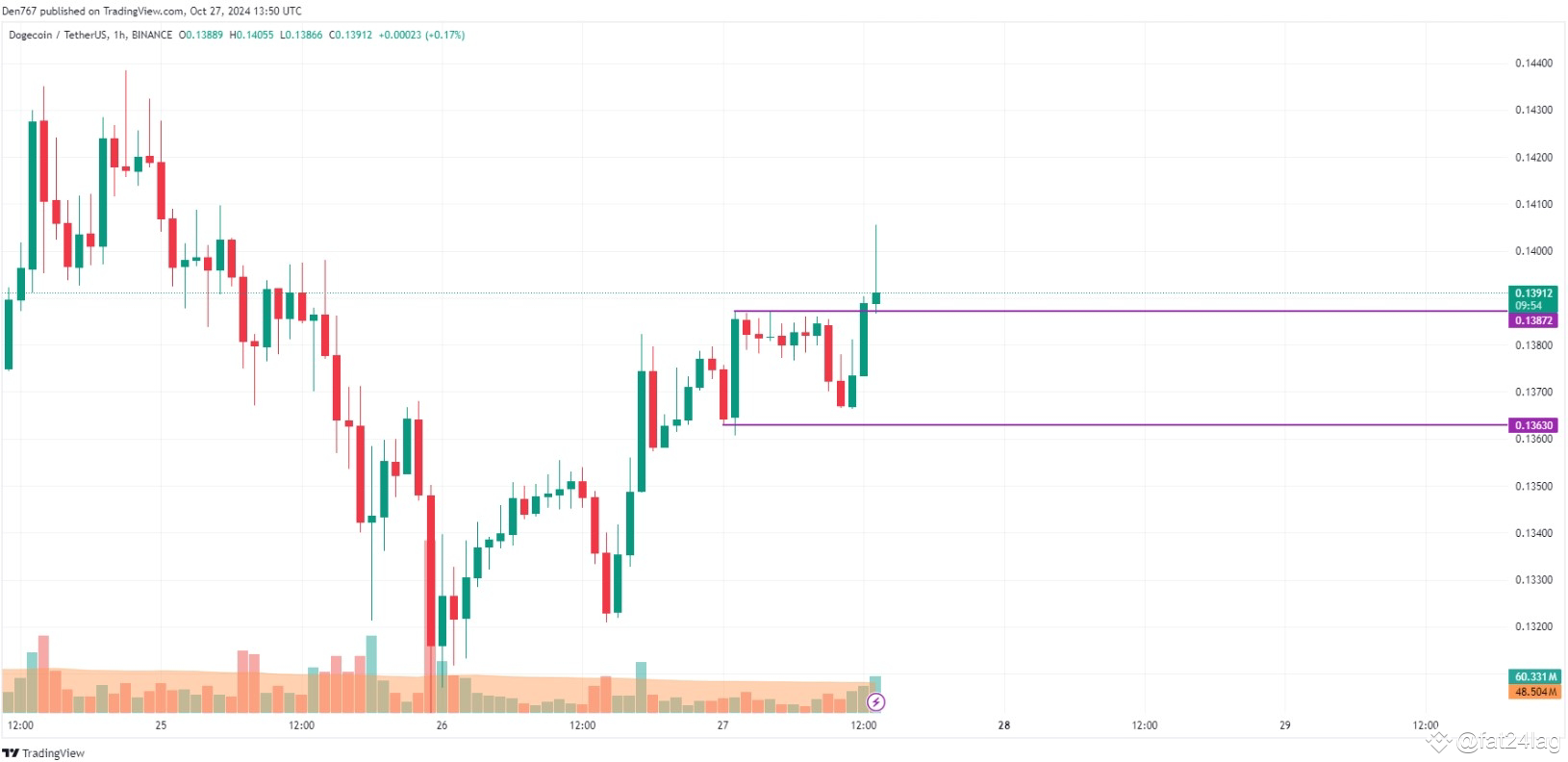 على الرسم البياني للساعة، يجب الانتباه إلى إغلاق الشريط من حيث مستوى المقاومة 0.1387 دولار. إذا أغلقت الشمعة بعيدًا عنه وبدون فتيل طويل، فقد يستمر النمو إلى مستوى 0.1420 دولار.