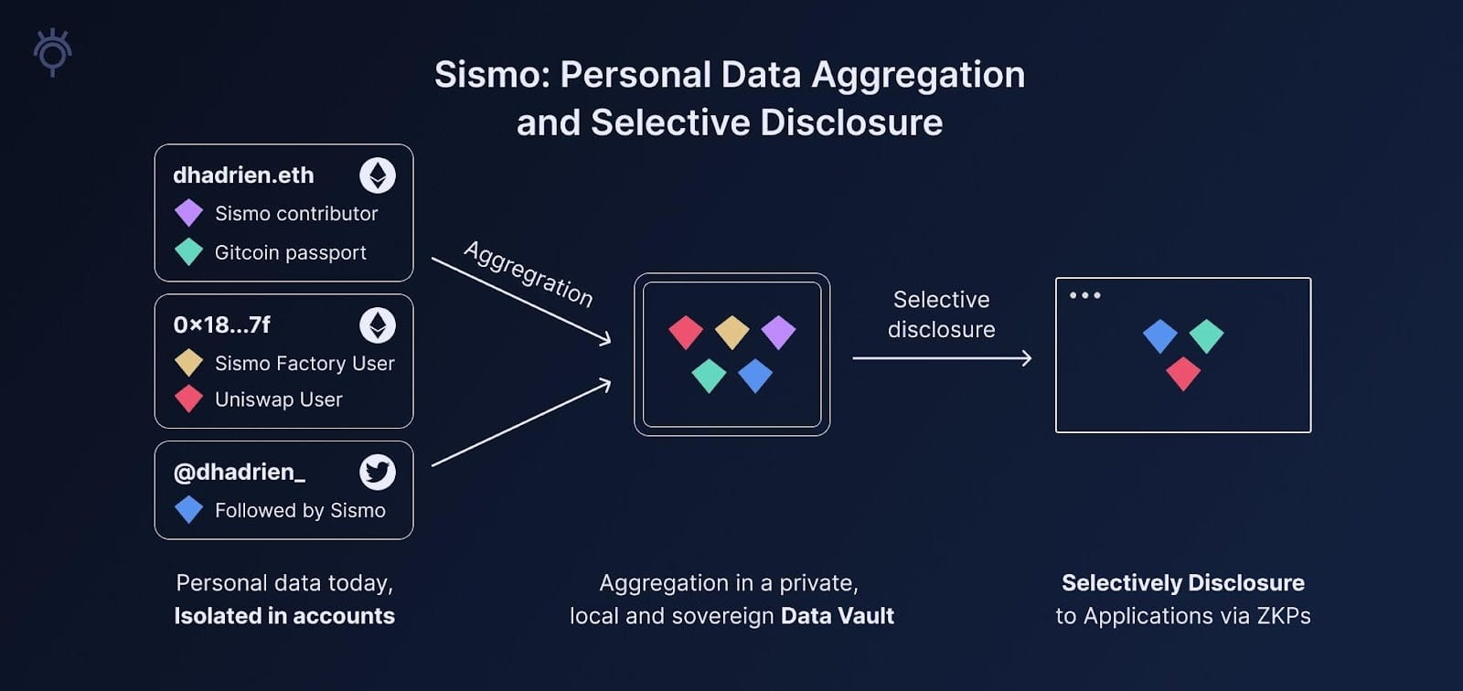 Sismo Connect 使应用能够请求访问用户数据,而无需直接接触敏感的个人信息。通过利用Sismo Connect,用户可以将其身份整合在数据保险库中,这是一个安全的加密存储库,用于存储从各种 Web2 和 Web3 来源收集的个人数据,包括各种凭证和证明。