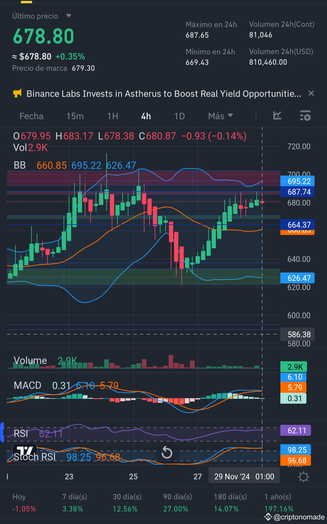 El precio actual de BNB es de $678.80, con un rango en las últimas 24 horas entre $669.43 y $687.65. Este movimiento indica consolidación en una zona clave, cercana a los límites superiores de las Bandas de Bollinger.