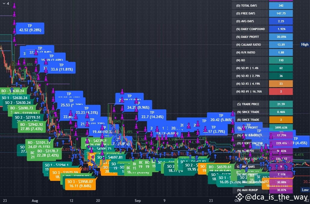 During the bear market, I fine-tuned my DCA (Dollar Cost Averaging) strategy, enabling me to generate consistent profits even while going long in a declining market. Below is a screenshot showcasing one of my top-performing strategies: