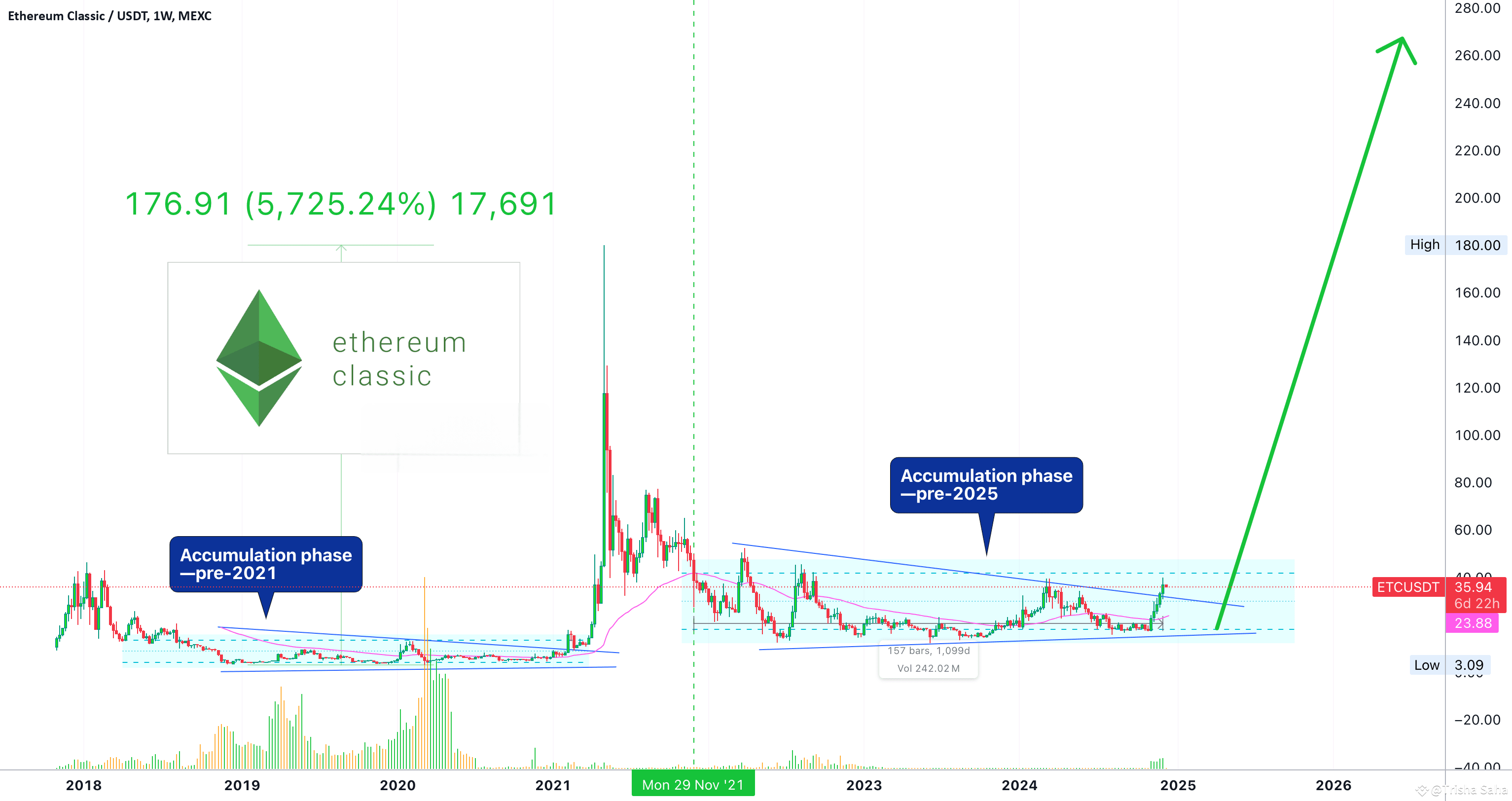 Just an update to mention that we continue bullish on #ETCUSDT . New ATH potential goes between $291 and $390, with a standard bull-market. With a current price of $36 this would amount to 11X and 8X. If we consider the market bottom after the ATH, just to extract the full potential of a bullish phase ending in those prices, we would have total growth of 3150% and 2316%. Not bad. If we get a super bull-market growth potential can go even further, but we are more than happy with 20-30X. In fact, even 10X or 5X is amazing so... The future is bright for us.