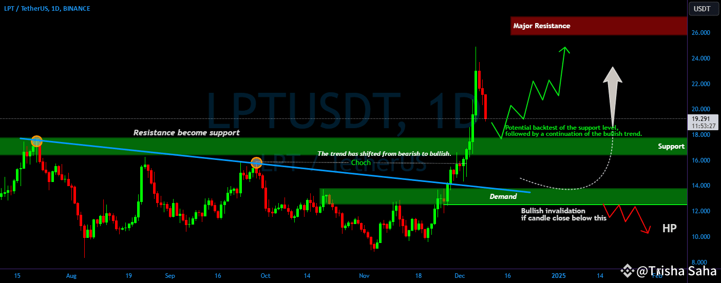 💎#LPT is eyeing a retest of the $17.7 - $16.4 support zone. If this area holds, we could see buyers stepping in to fuel a bullish continuation, potentially targeting the major resistance zone. This would align with the broader bullish trend we’ve been tracking.