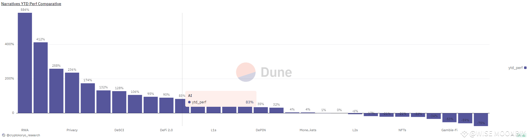 The AI narrative led to 83% gains in the year to date, lagging behind other trends, but gaining social media share at the end of the year. | Source: Dune Analytics