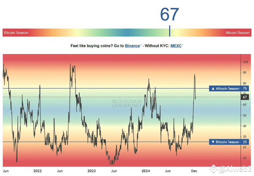 Currently, it indicates a score of 65, suggesting that alt season is imminent.