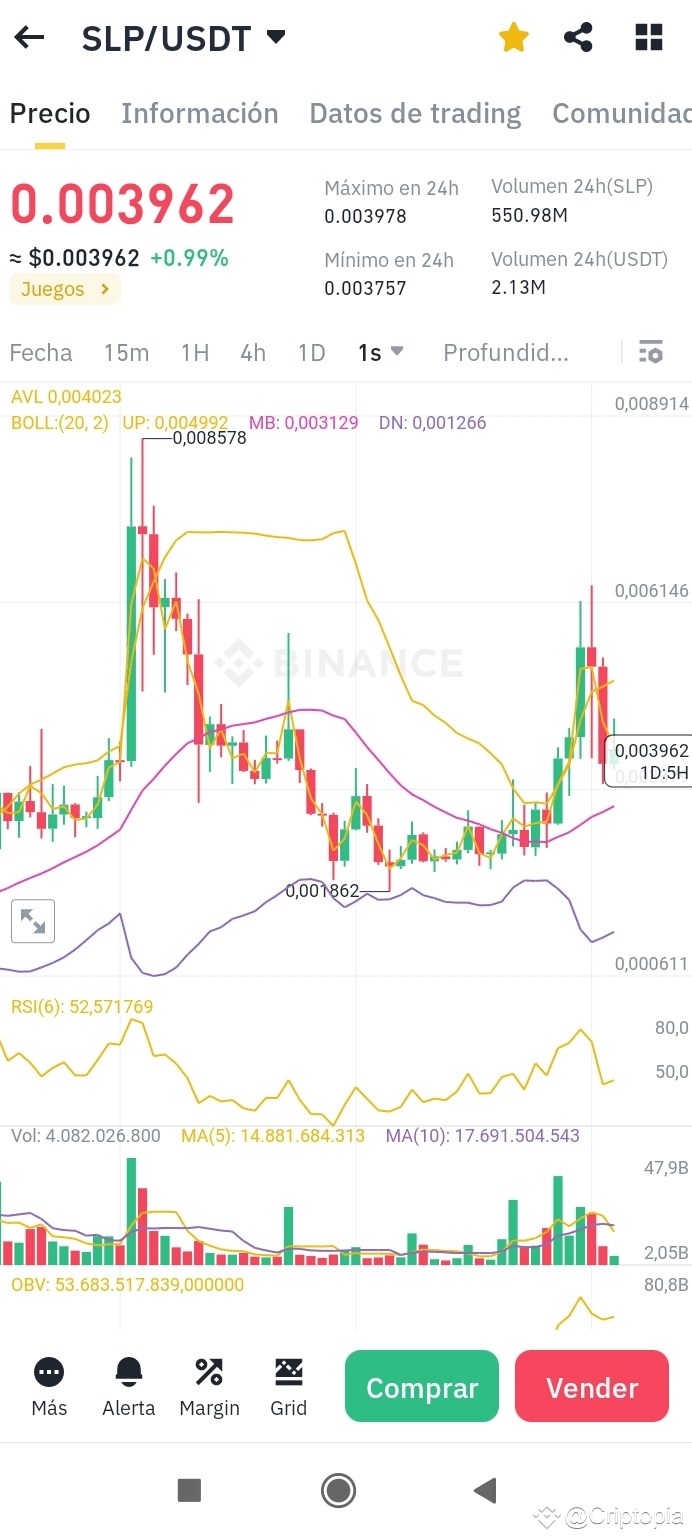 El token SLP (Smooth Love Potion) ha mostrado un ligero aumento en las últimas 24 horas, alcanzando un precio de 0.003962 USDT. Este crecimiento, aunque modesto, podría indicar un renovado interés en el mercado de juegos play-to-earn y en particular en el ecosistema de Axie Infinity, del cual SLP es una moneda fundamental. El precio se encuentra por encima de su media móvil de 20 períodos, lo que sugiere una tendencia alcista a corto plazo. Las Bandas de Bollinger se muestran relativamente estrechas, indicando una posible consolidación del precio en los próximos días. Por otra parte el RSI se encuentra por encima de 50, lo que confirma el sentimiento alcista.