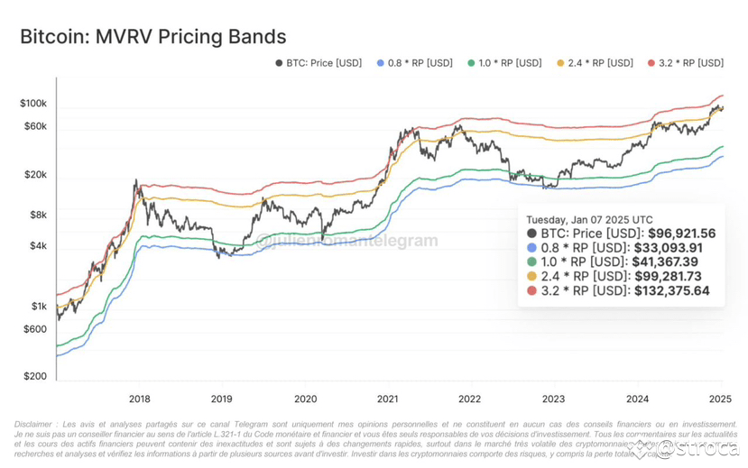 Si les 100.000$ (ligne jaune) sont cassés, la prochaine zone de résistance sur cet indicateur se trouve à plus de 132.000$ (3,2*RP). Lors des deux derniers bull run (2017 et 2021), le Bitcoin avait même largement dépassé ce niveau on-chain…