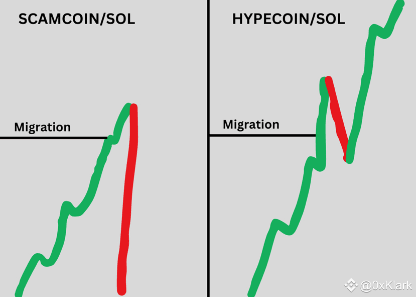 Most memecoins look like the “Scamcoin” chart (big pump followed by a major dump).