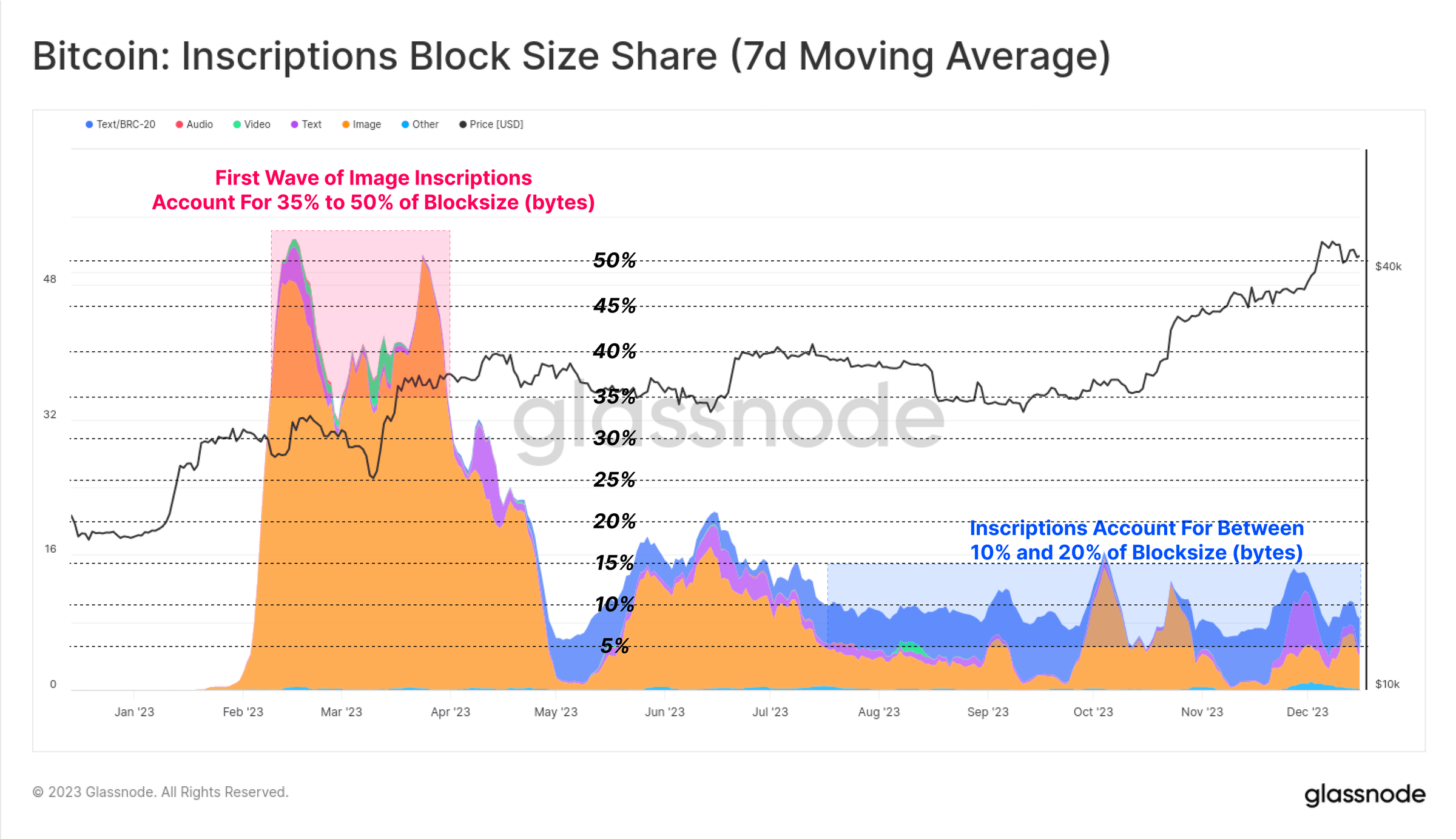 有趣的是,虽然铭文交易量约占已确认交易的 50%,但令人惊讶的是,它们仅占用区块空间的 10% 至 15% 左右。这是因为文本文件较小以及与 SegWit 的数据折扣。
