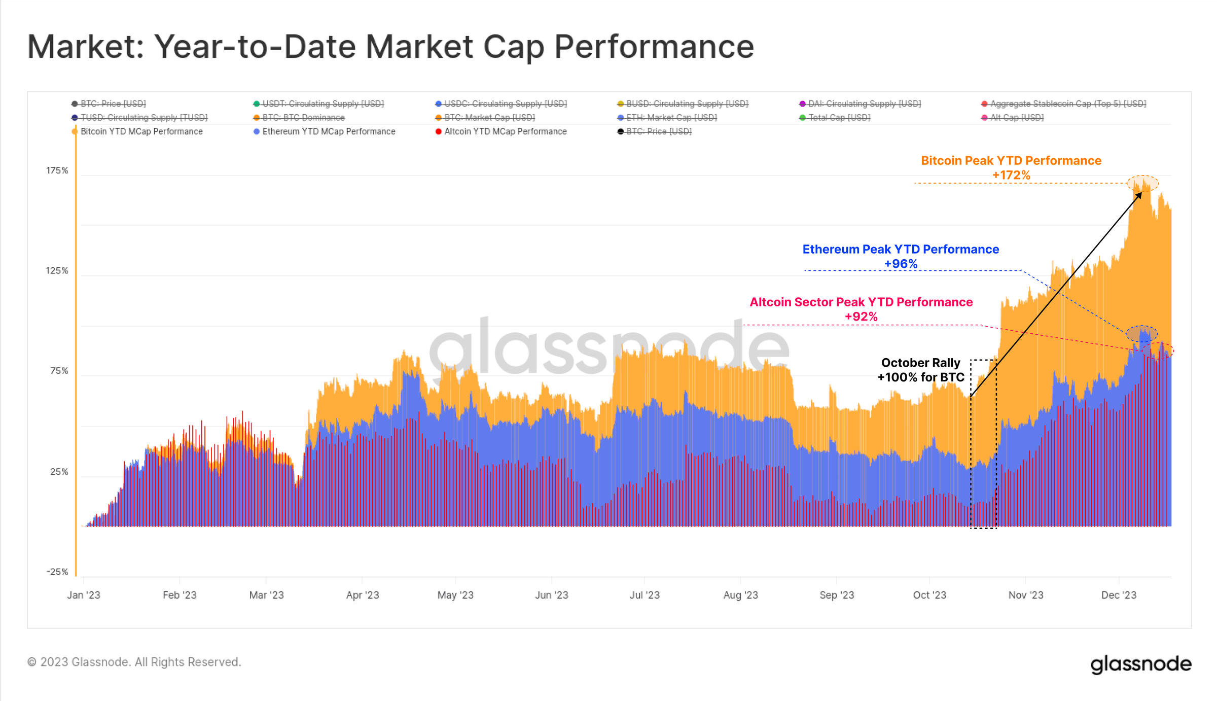 2023 是令加密行业难忘的一年,比特币上涨超过 172%。其他数字资产表现也相当强劲,以太坊和大部分山寨币的市值增长了 90% 以上。