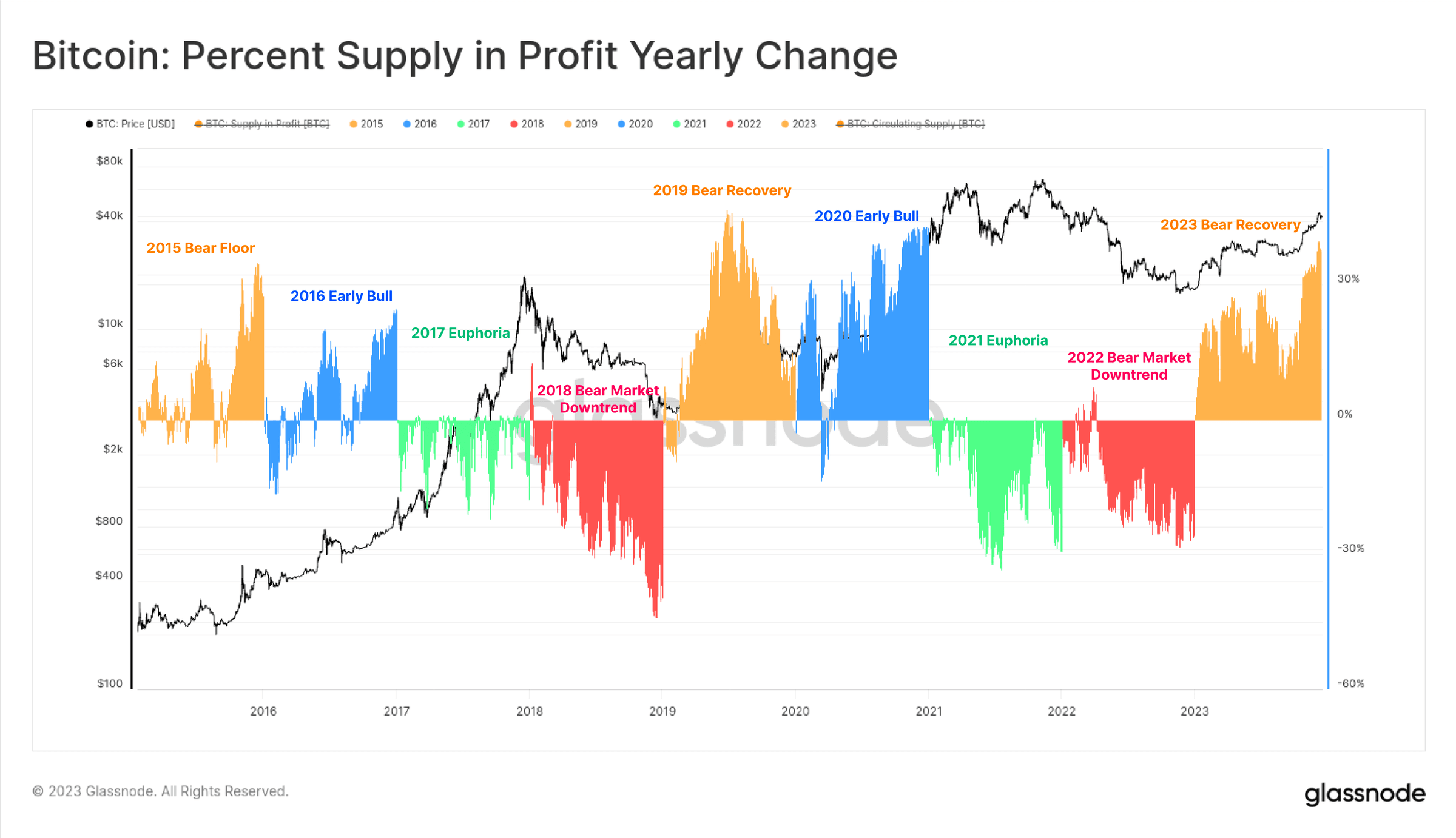 下图直观地展示了自 2015 年以来每年的盈利供应百分比变化。虽然按年份划分并不完全合适,但每四年的比特币周期让我们发现了一些有趣的规律: