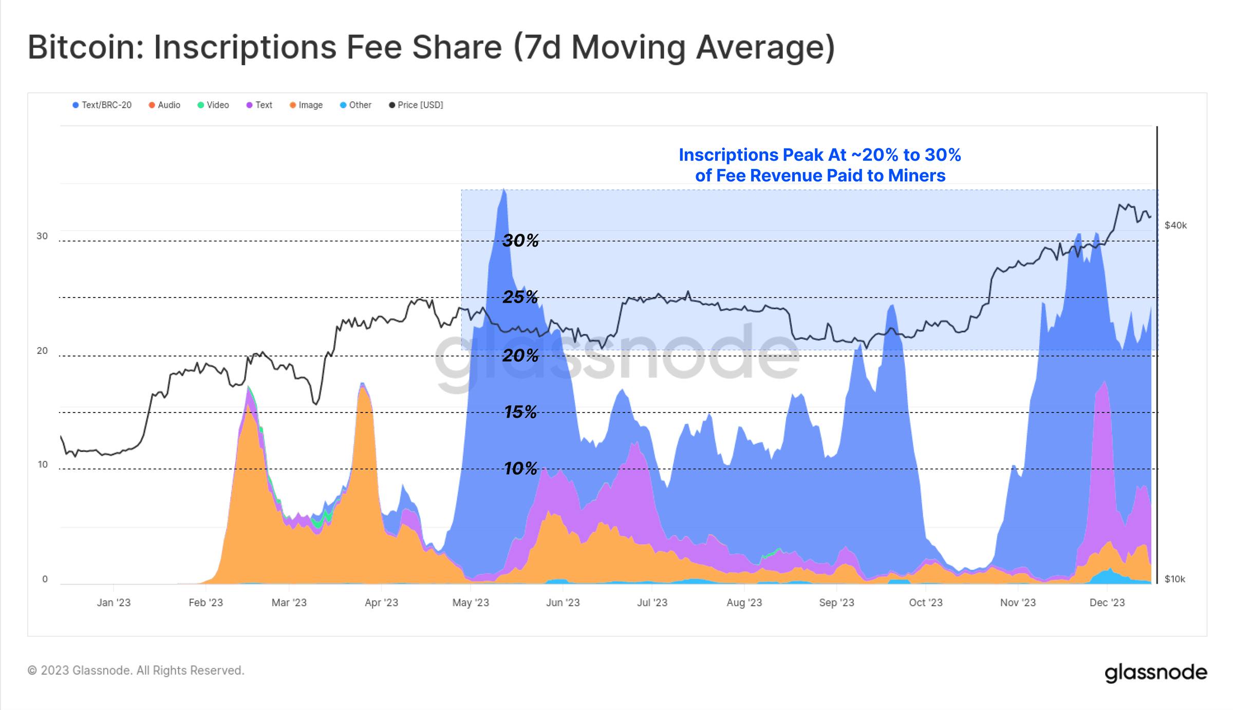 实际上,铭文和 SegWit 数据折扣允许开采者将更多交易放入相同的最大区块中,从而支付更多费用。如果市场对铭文的需求持续存在,可能将改善开采者的收益,特别是在第四次减半即将到来的情况下。