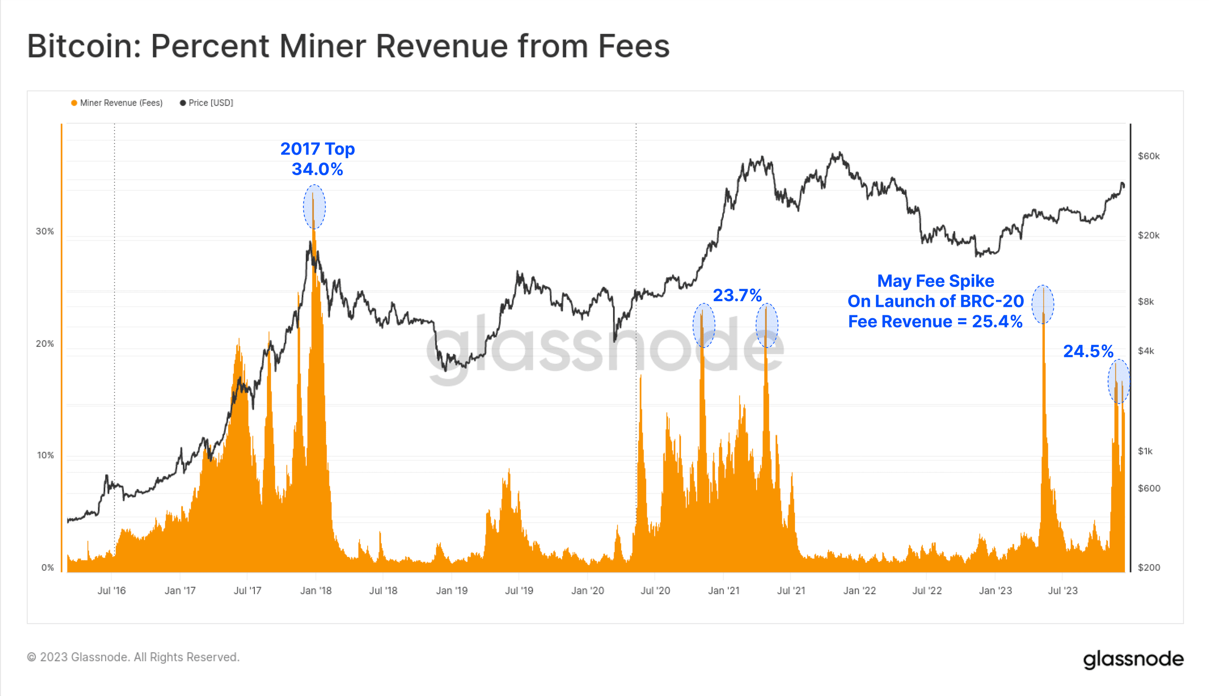铭文——比特币区块空间的新买家,使开采者的费用收入大幅增加,2023 年有几个区块支付的费用甚至超过了 6.25 BTC 的区块奖励。今年出现了两次费用大幅上涨,目前费用约占开采者收入的四分之一。这与 2017 年和 2021 年牛市的欣快阶段相当。