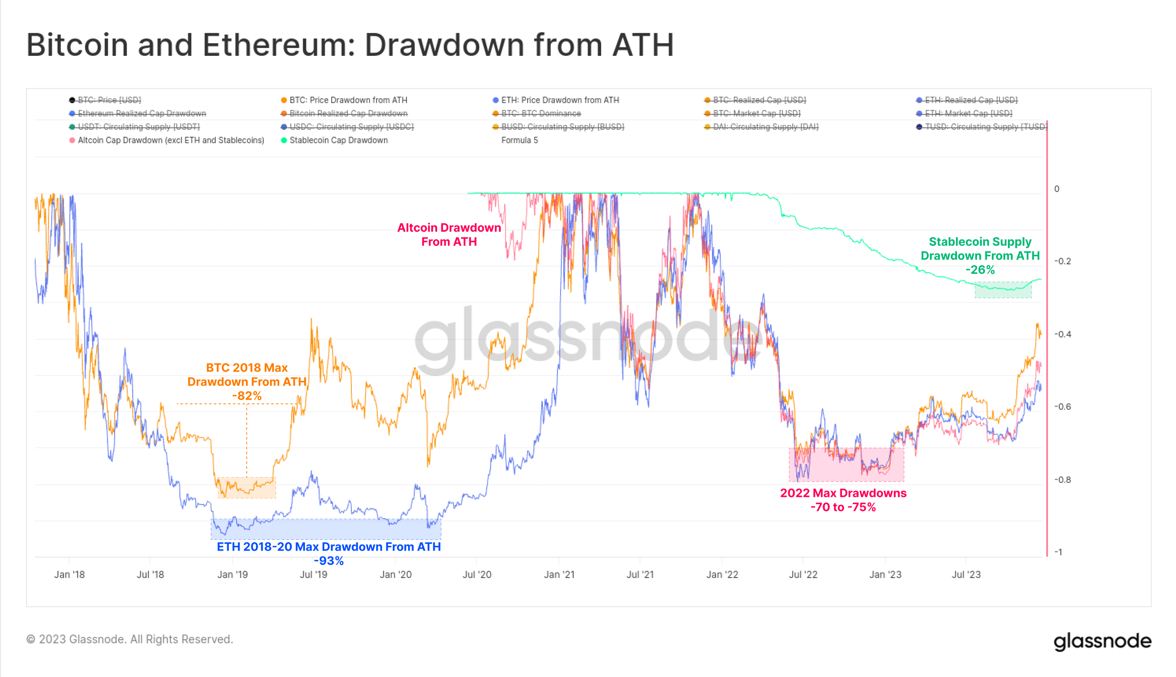 2022 年熊市的残酷程度略低于 2018-20 年熊市周期,大多数主流数字资产从 2023 年开始均较其 ATH 下跌 75%,不过近期的强劲表现弥补了大部分损失。当前主流数字资产相较于其 ATH 回落 40%(BTC)、55%(ETH)、51%(山寨币,不包括 ETH 和稳定币)和稳定币供应量(24%)。