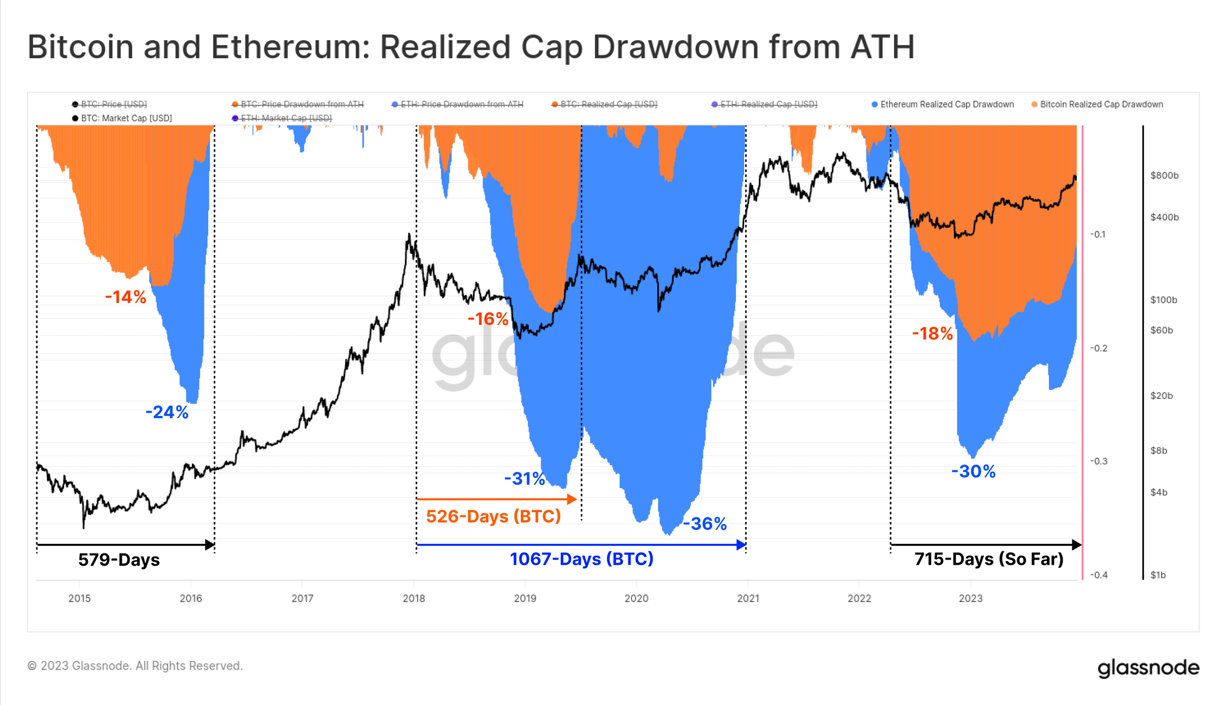 从链上角度来看,BTC 和 ETH 的已实现市值可以跟踪各自资本流动情况。2022 年熊市期间的总已实现市值下降达到了与之前周期相似的水平,BTC净资本流出18%,ETH 净资本流出 30%。