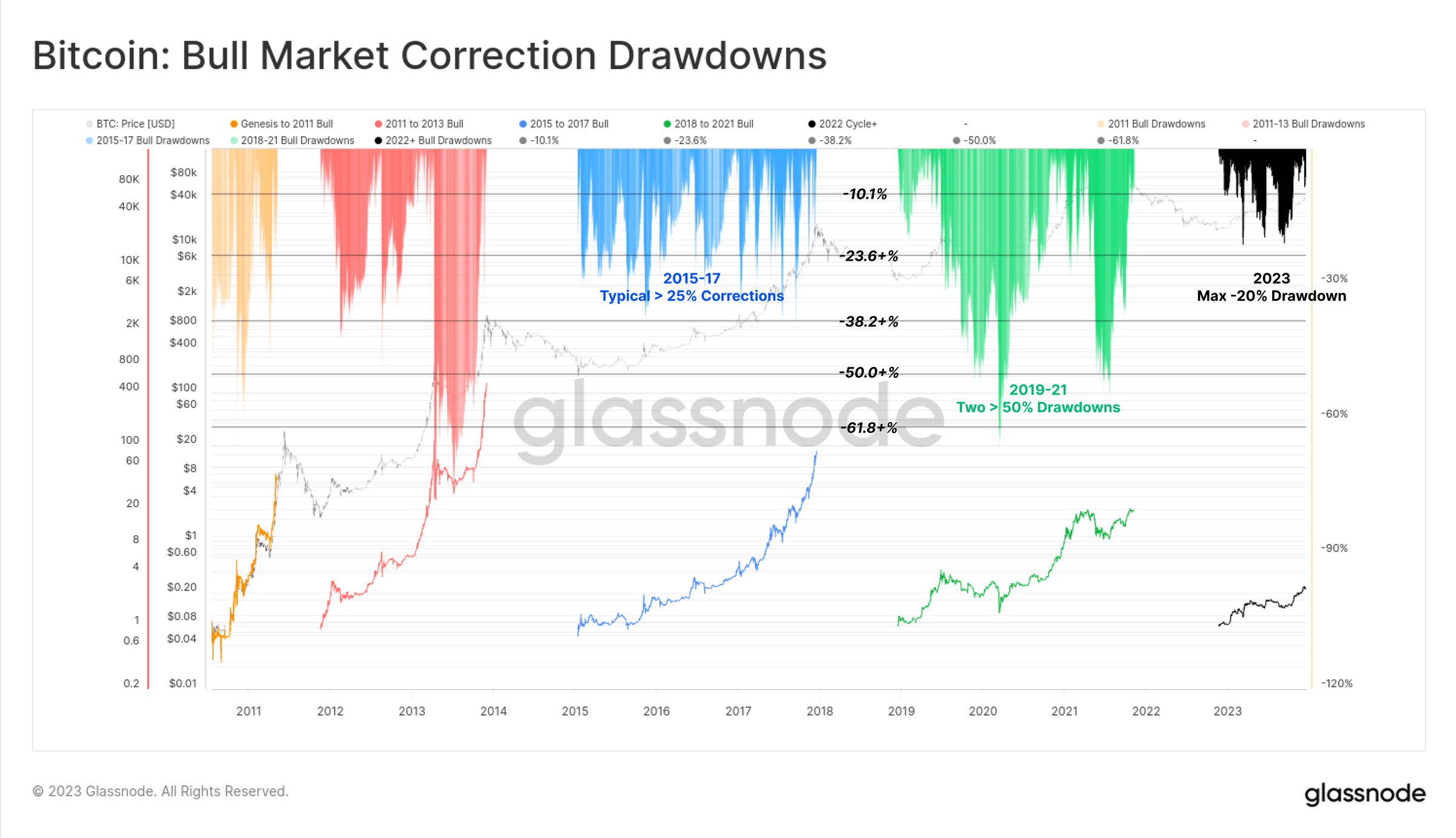 2023 年另一个独特表现是比特币所有价格回调的深度都非常浅。从历史上看,比特币在熊市复苏和牛市上升趋势期间通常会从局部高点回调至少 25%,甚至很多时期超过50%。