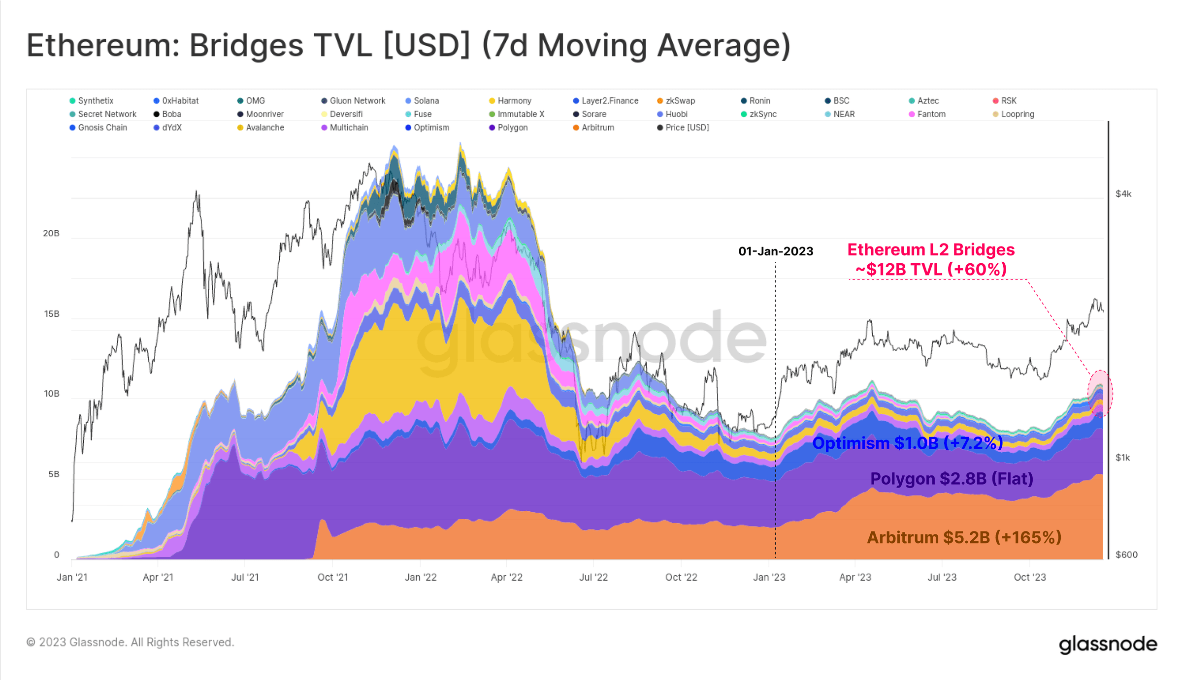 虽然 ETH 价格表现落后于大部分数字资产,但其生态系统仍在不断扩大、成熟和发展。特别是,锁定在不断扩大的 Layer-2 区块链中的总价值增加了60%,其中超过 120亿美元锁定在跨链桥中。