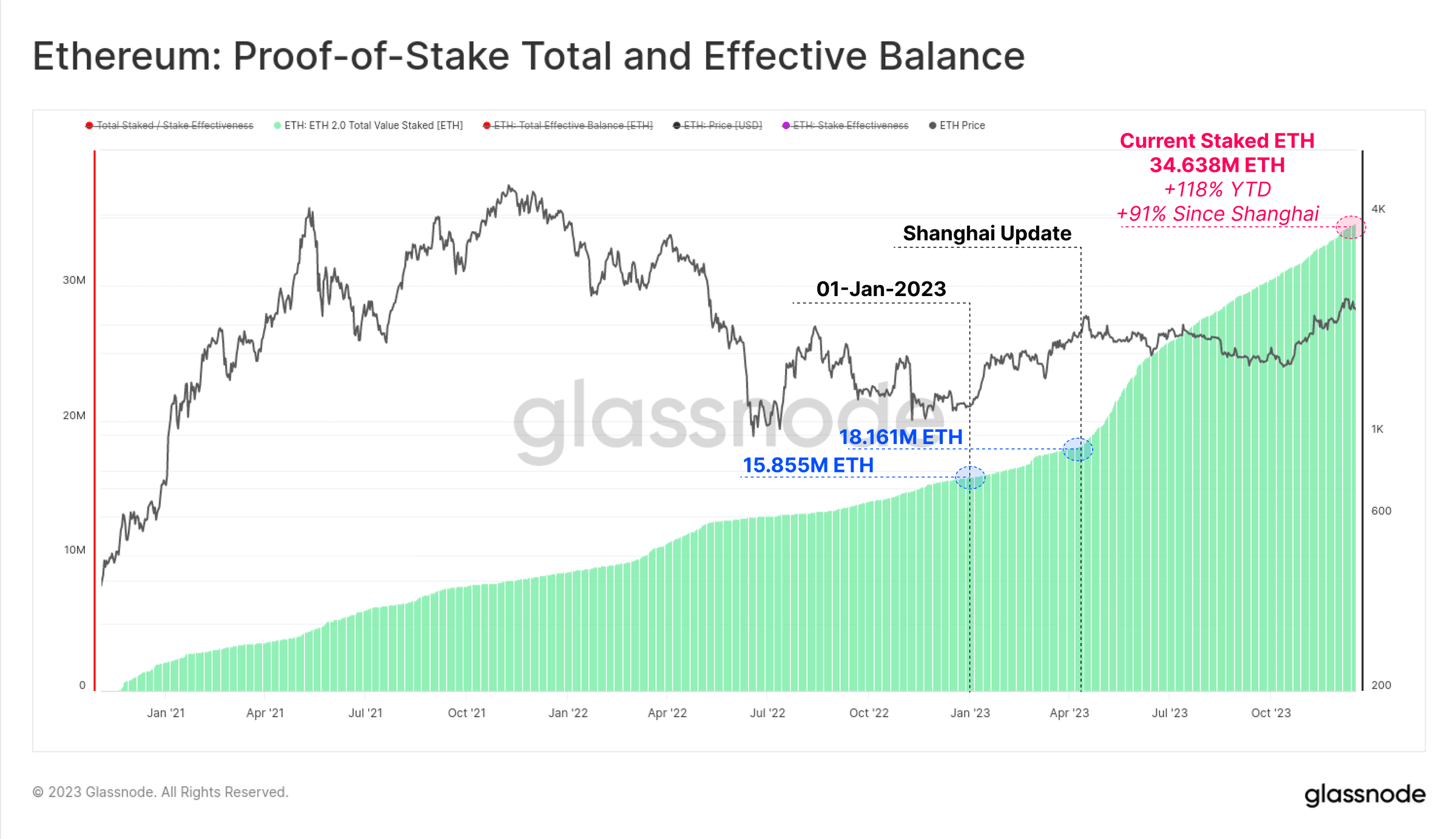以太坊的另一个关键增长领域是通过PoS质押的 ETH 总量。2023年以来,ETH 的质押数量增长了 119%,目前锁定在质押协议中的 ETH 数量已超过 3463.8 万枚。上海升级也在 4 月份成功推出,自 2020 年 12 月信标链推出,首次允许质押者提现,并重新洗牌流动性质押提供商。