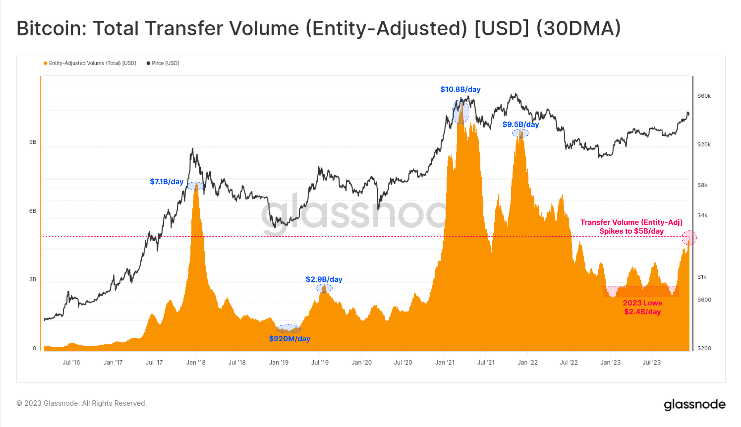 我们可以看到,10月之前比特币的交易量相对停滞,10 月份的上涨促使比特币的交易量翻了一番,从每天 24亿美元增加到每天超过 50亿美元,这是自 2022 年 6 月以来的最高水平。这再次向我们证明了“10 月份在某种程度上是市场阶段性转变”。