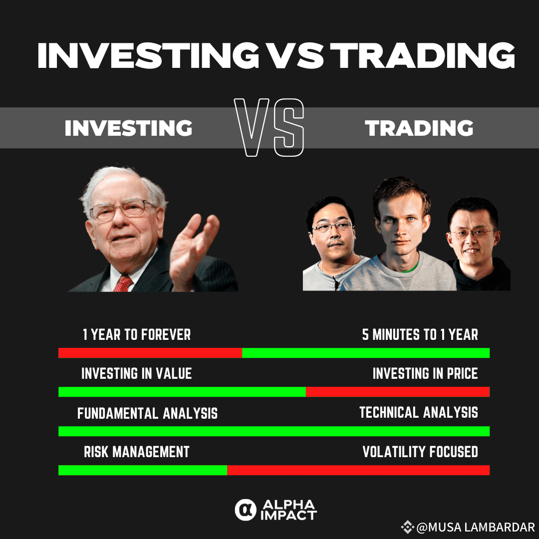 Investing: A long-term approach where you buy assets (stocks, real estate, crypto, etc.) and hold them for years or even decades. The goal is to build wealth through asset appreciation and dividends.
