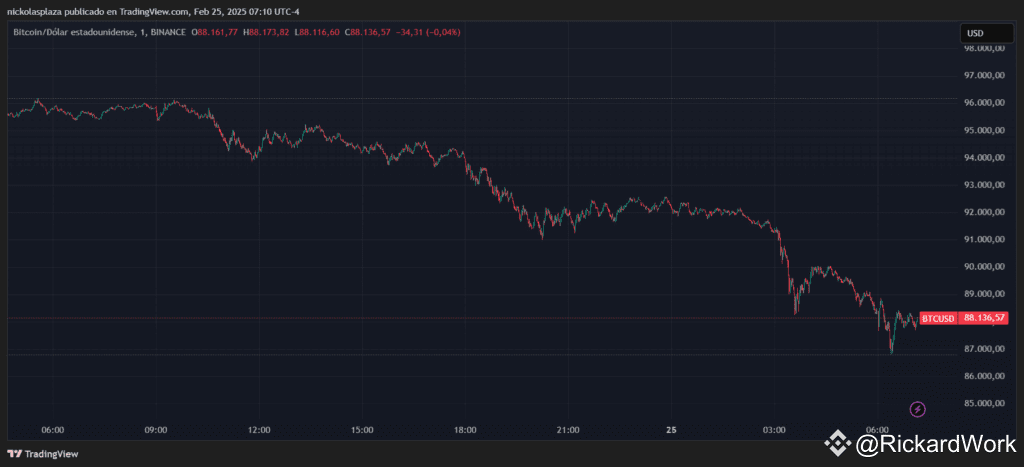 Las liquidaciones masivas coincidieron con una caída del precio de bitcoin del 8%, llevándolo a la zona de los 87.800 dólares, en las últimas 24 horas, como se aprecia en el gráfico de TradingView.