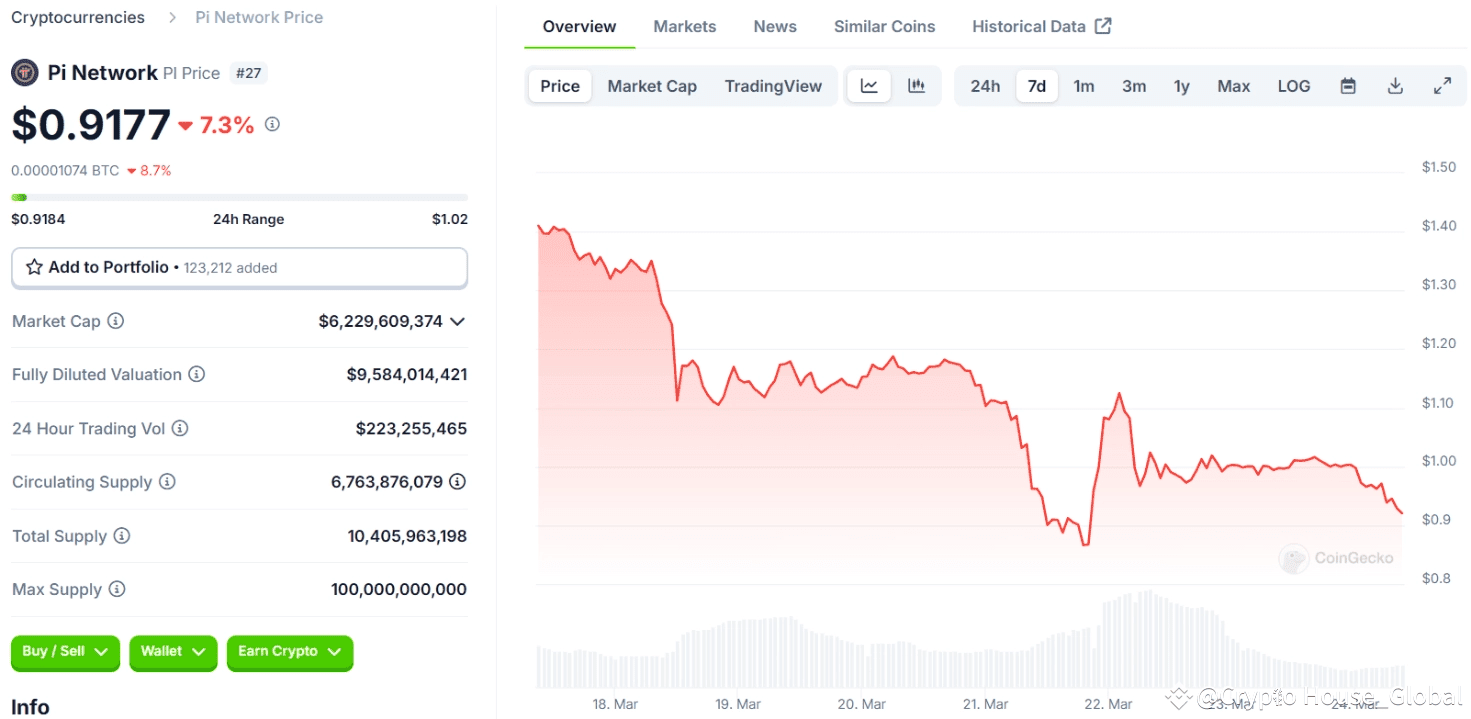 Currently, Pi Network (PI) is trading at below $1, down nearly 70% from its historical peak of $2.98 in February. In the past week, the price has dropped by 34% and fallen to 27th place in the market capitalization rankings. The trading volume is now just over $200 million, a significant decrease from early March.