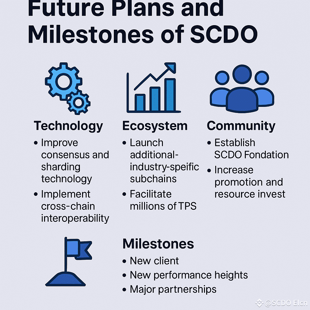 在社区方面,可能会成立SCDO基金会以统筹生态发展,并加大宣传和资源的投入。短期里程碑包括新版客户端的发布、性能指标的提升以及重大合作的达成;中长期目标则包括实现千万级TPS(通过更多分片和子链)和代币全部挖出后主网进入稳定期等。