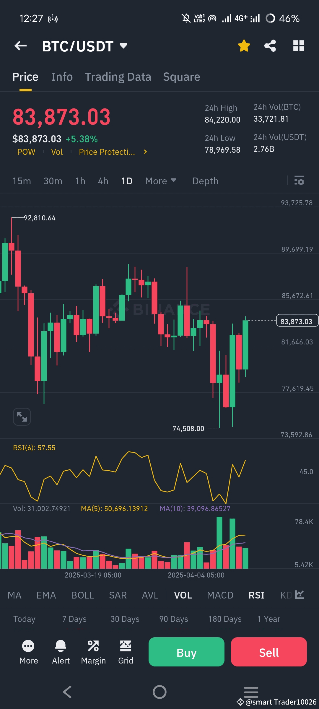 BTC is at $83,873.03, up 5.38% in the last 24 hours.