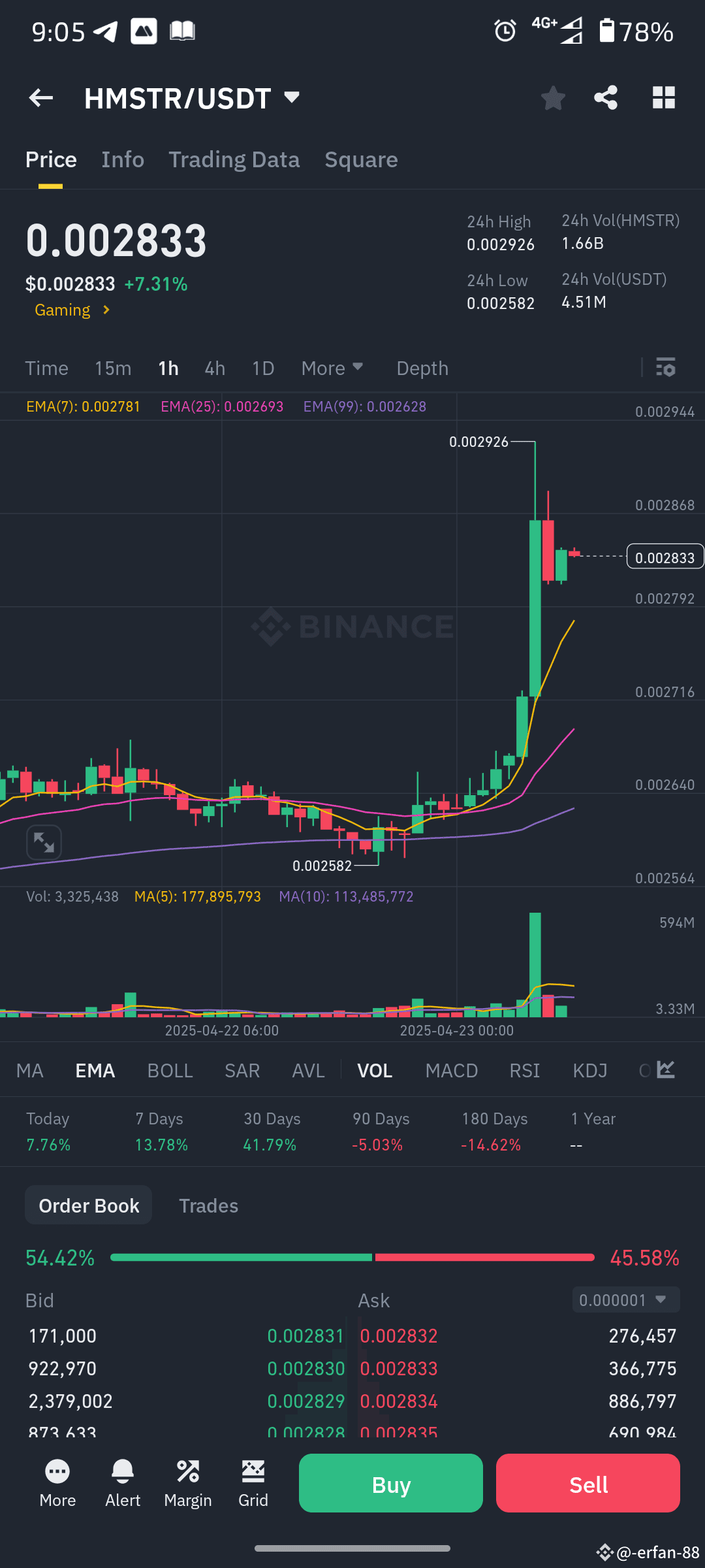 EMA(99): 0.002628 (Purple)