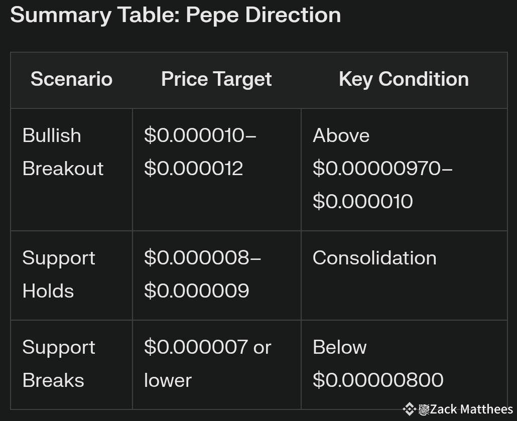 Targets: If momentum continues, PEPE could test $0.00001000–$0.00001150, with some analysts projecting a short-term spike up to $0.00001163 or higher.