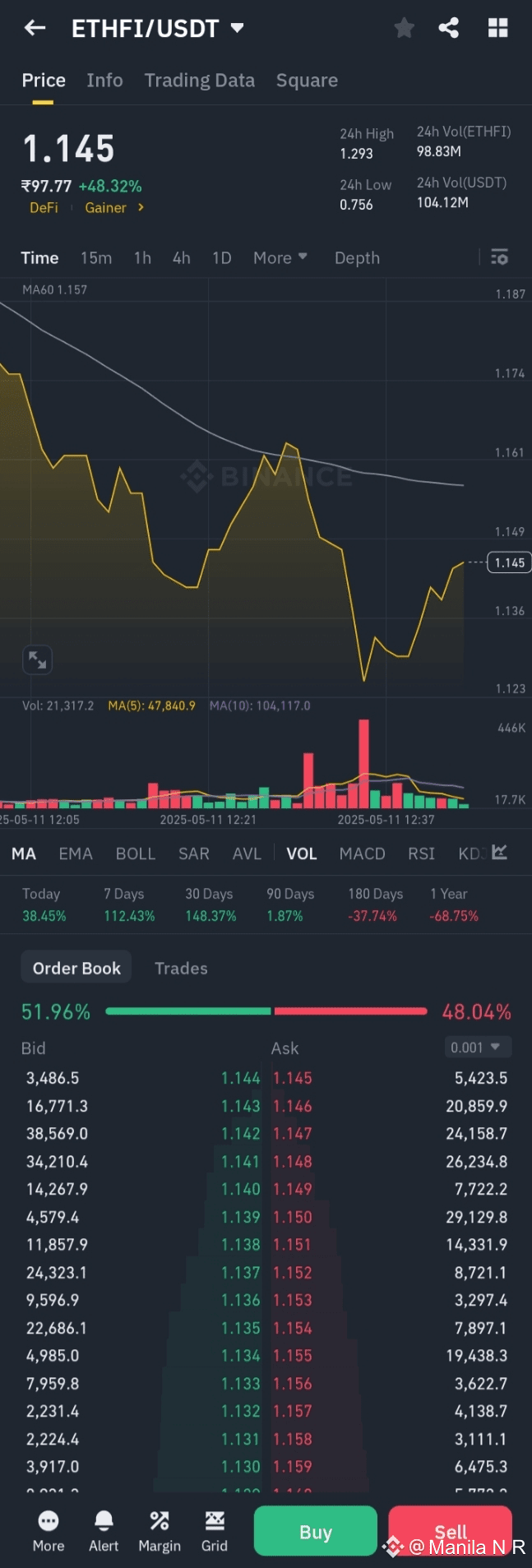 As of May 11, 2025, Ether.fi ($ETHFI ) is trading at approximately \$1.09, reflecting a modest intraday gain of 0.42%. The token's price has ranged between \$0.77 and \$1.28 over the past 24 hours.