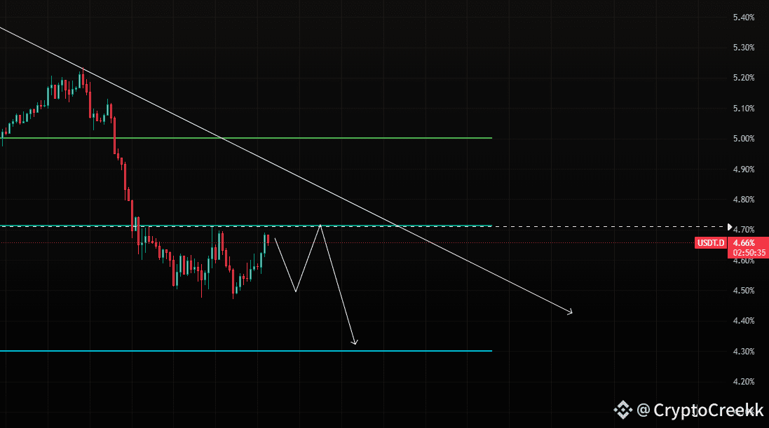 USDT.D is bearish below the cyan level, most likely we are going to see a dump here to its next level. Entire market is bullish here.