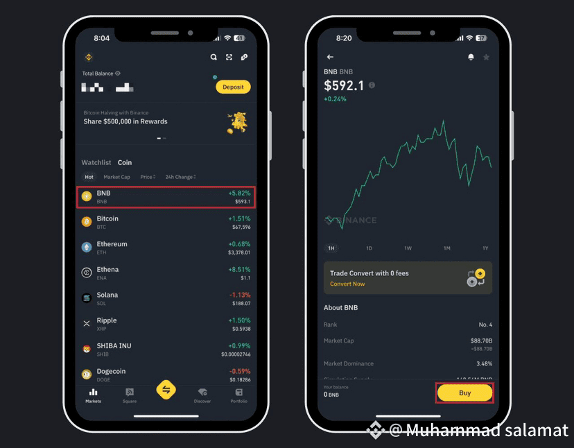 Click on the cryptocurrency you want to buy. Let's say you want to buy BNB. Click on BNB, a page will appear on which you will see a simple BNB trend chart, the current price, and coin specifics.