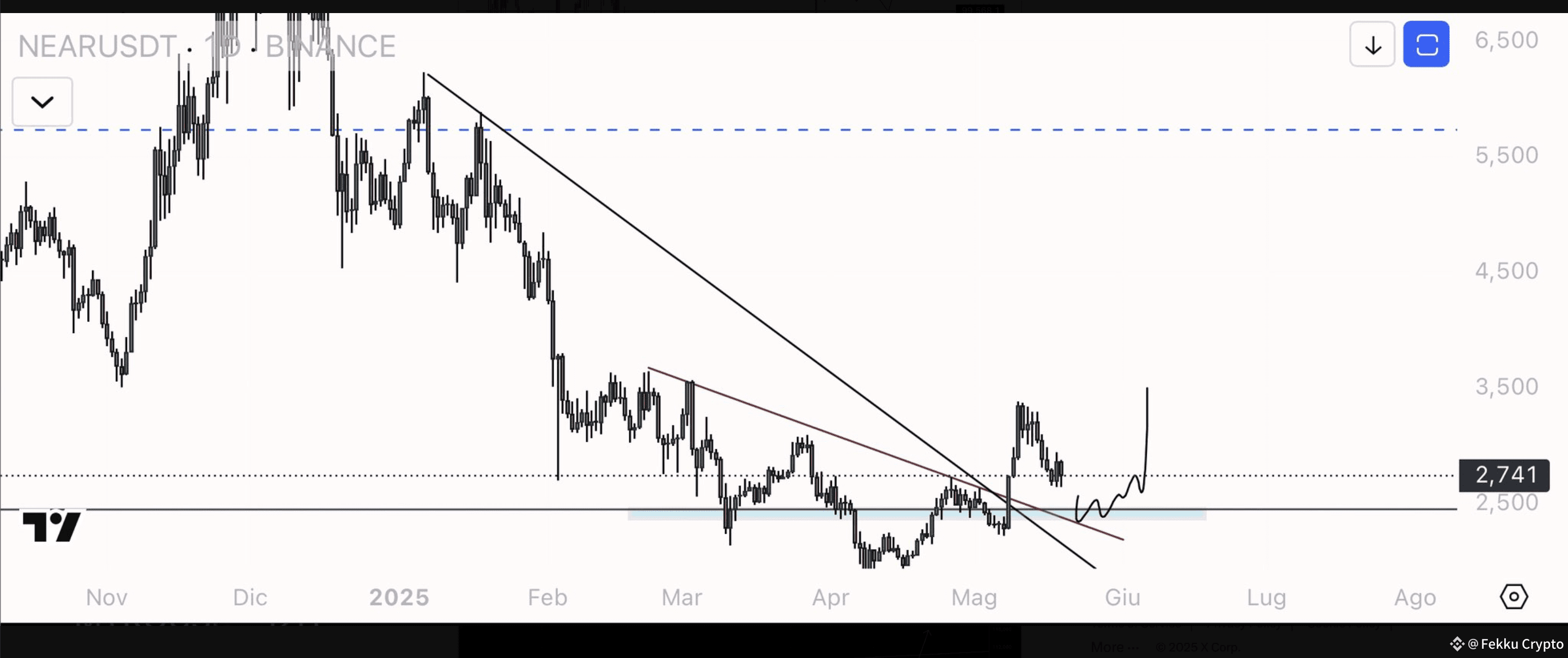 After months of a downtrend, NEAR finally broke through two key trendlines (black and red lines). It’s now pulling back and testing the support zone around $2.50–$2.70 (light blue area).